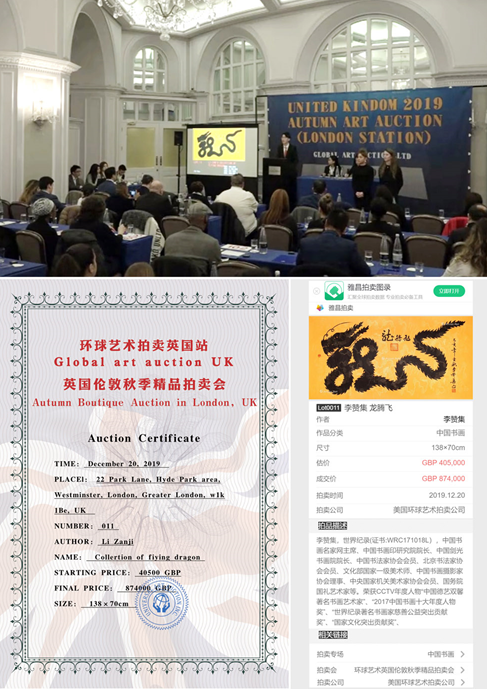 近日,美國(guó)環(huán)球藝術(shù)拍賣(mài)“環(huán)球藝術(shù)英國(guó)倫敦秋季精品拍賣(mài)會(huì)”于2019年12月20日在英國(guó)倫敦進(jìn)行藝術(shù)品拍賣(mài),世界紀(jì)錄當(dāng)代知名書(shū)畫(huà)藝術(shù)家李贊集作品應(yīng)邀參加此次拍賣(mài)會(huì),其書(shū)法作品“龍騰飛”138×70cm,以GBP:874000英鎊拍賣(mài)成交,作品拍賣(mài)所得款全部樂(lè)捐給社會(huì)慈善機(jī)構(gòu),為慈善公益事業(yè)奉獻(xiàn)愛(ài)心。