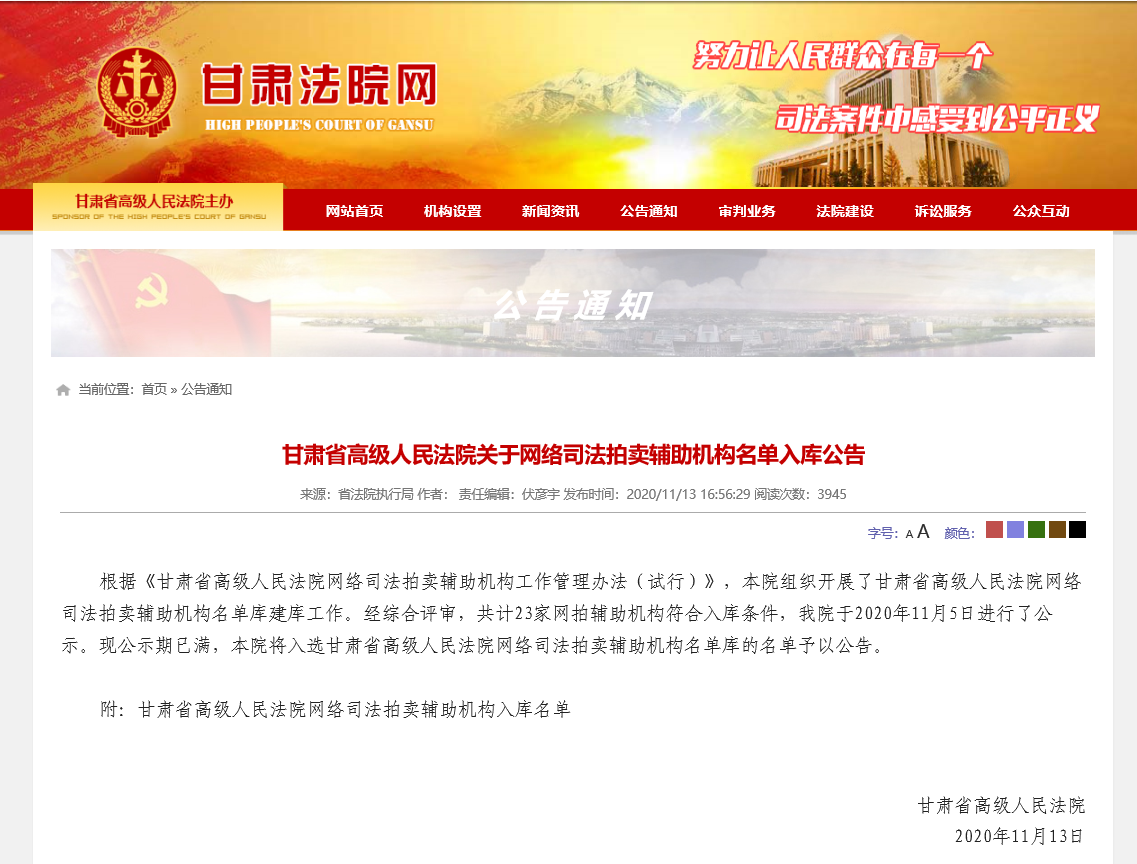 2020年11月通過甘肅省高級人民法院網(wǎng)絡(luò)司法拍賣輔助機(jī)構(gòu)名單入庫