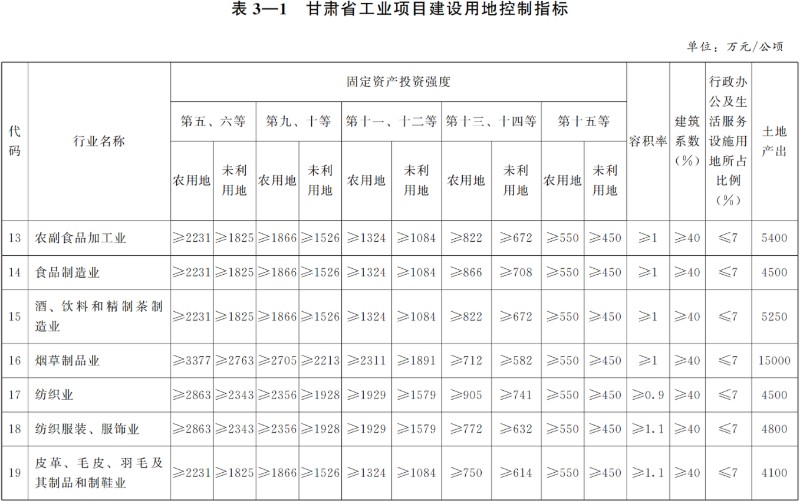 甘肅省工業(yè)項(xiàng)目土地使用標(biāo)準(zhǔn)